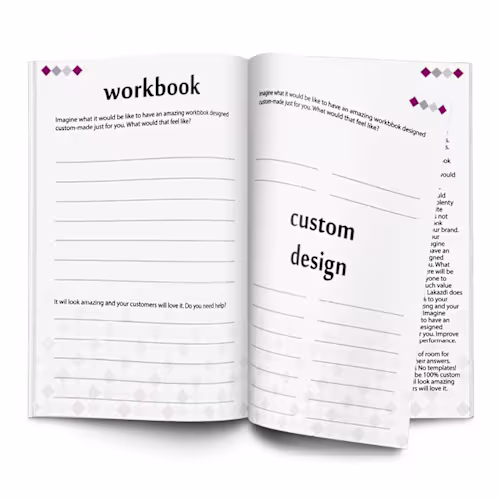 Have your workbook design brought up to the professional level your students deserve. Lakazdi will take your branding and transform your materials to the high quality level you cannot achieve without having specific design skills. Focus on your offering instead of design. No two workbooks will be the same because the audience and content are always so different. Don’t settle for a template or the basic look. Use this workbook design for meetings, workshops, face-to-face delivery, classrooms, seminars, online teaching, courses and a wide range of other situations. Can be used in any industry.