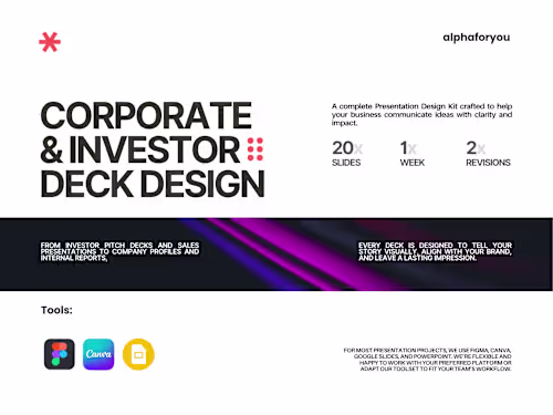 -Final files shared in editable and export formats -1 round of post-delivery support for updates or format tweaks -Guidance on maintaining design consistency across future decks