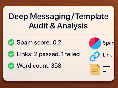 There are numerous tools online to check spam content, but this audit dives deeper than just identifying the usual spam suspects such as "offer", "sell" and "free". I will analyze your message for tone, relevance to the recipient, unique selling points and if you are presenting your offering in its best light.