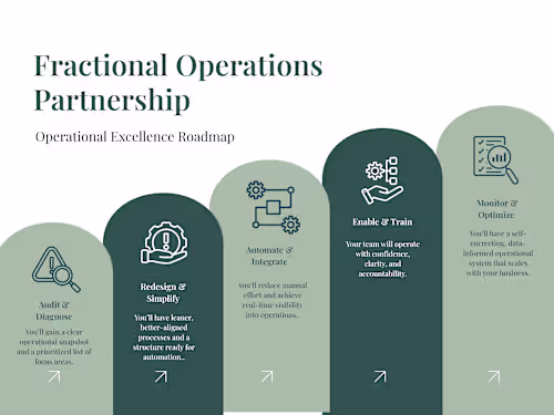 Gain a strategic partner to streamline your operations, improve cross-functional workflows, and prepare your business for sustainable scale. As a Fractional Ops Advisor, I align people, systems, and data through process mapping, tool integration, and decision frameworks that bring clarity to chaos.