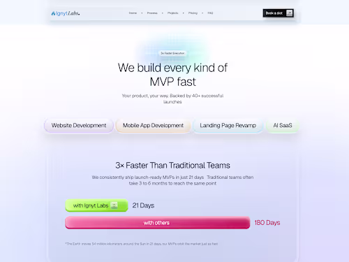 Most MVPs are delivered in 21 days. That includes: Planning your core features, building your full frontend + backend, and launching a live, testable product. If your project has more complexity or additional features, it may take 4–5 weeks but we'll always be transparent about timelines from day one. The speed comes from our structured AI-assisted workflow, not cutting corners.