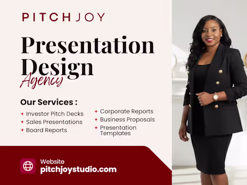 Bespoke presentation design tailored to your brand and audience Editable file in your preferred format (PowerPoint, Google Slides, Keynote, or Canva) Export-ready PDF Strategic layout with visual hierarchy optimized for impact 2 rounds of refinement All source files and assets