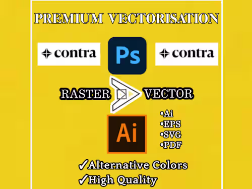 Conversion of a raster image or logo into a vector file. Delivery in AI, EPS, and PDF formats on high résolution. Unlimited révision. Delivery time: 2 days Alternative Colors: Get color variants of your vectorized image. Conversion to Specific Formats: Conversion to other specified formats not listed.