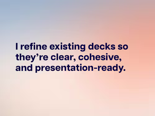 A fully cleaned-up presentation deck with refined layouts, improved visual hierarchy, consistent typography, and updated styling based on your brand guidelines. All slides will be organized, cohesive, and presentation-ready.