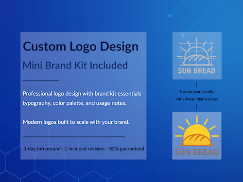 Includes the primary logo, variations, a mini brand kit with colors, fonts, and usage notes plus a signed NDA to protect your brand assets.