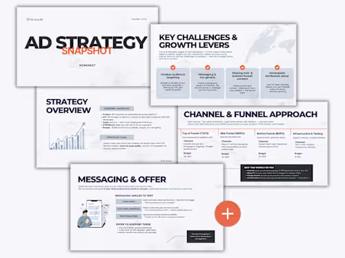 Mini strategy deck outlining paid media recommendations based on your product, website, audience, and funnel stage. Includes platform recommendations, messaging angles, ICP targeting suggestions, and budget guidance — designed to help you confidently move forward with performance campaigns.