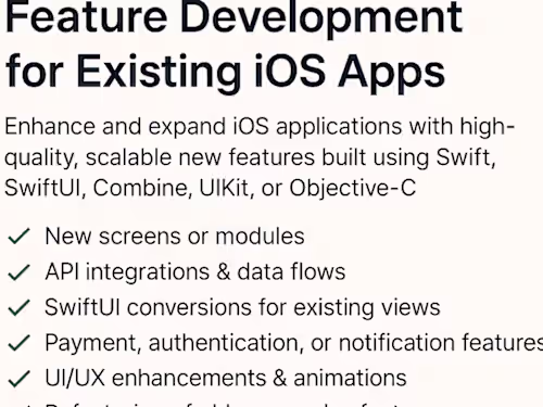 Add new features, screens, modules, or functionalities to an existing Swift/SwiftUI app. Great for clients who need ongoing enhancements.
