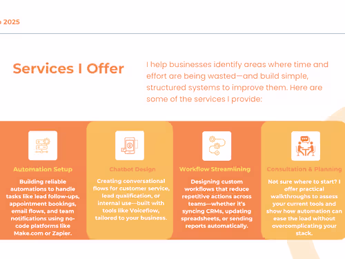 I specialise in Make.com, Voiceflow, Airtable, Google Workspace, and OpenAI API.