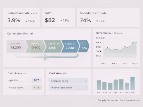 Comprehensive audit of PDPs, collections, cart, and checkout to identify friction points, drop-offs, and revenue leaks using Shopify analytics and UX best practices.
