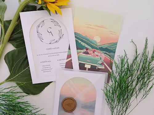 I will offer a color palette and show you the first colored version of the illustration. And show the first looks of the invitation with the packaging.