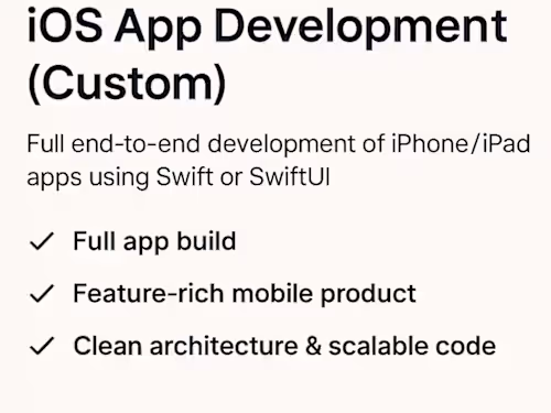 Full end-to-end development of iPhone/iPad apps using Swift or SwiftUI. Good for clients who want: 1. Full app build 2. Feature-rich mobile product 3. Clean architecture & scalable code