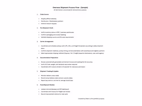 A structured SOP defining how orders, packing lists, exceptions, and escalations should be handed over and processed between your team and 3PL warehouses.