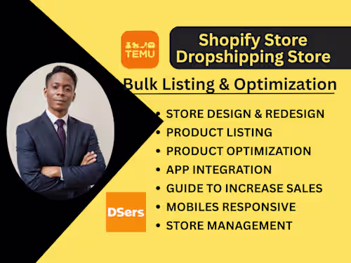 Setup Create or Build Shopify dropshipping store Design redesign with Temu Doba Zendrop Dsers eprolo bdroppy salehoo Want to have a LEGIT Professional Shopify Expert help you create your own store that can generate money from ANYWHERE in the world? That's what I'm here for! My work doesn't stop until you're completely satisfied with the finished product. Plain and simple.