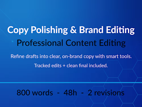 Just your draft (any format: Google Doc, Word, Notion) and a quick note about your audience or brand voice. If you don’t have guidelines, I’ll help shape the tone. Send 1–2 samples you like; I’ll mirror tone and build a mini voice note for future pieces.
