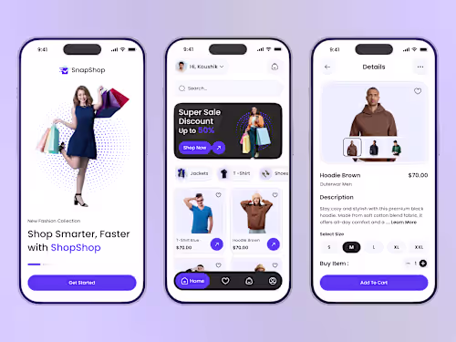A modern Fashion E-Commerce App UI design that delivers a sleek shopping experience with curated collections, personalized recommendations, and a seamless checkout flow. Designed to highlight trends, make browsing effortless, and enhance customer engagement for online fashion stores.