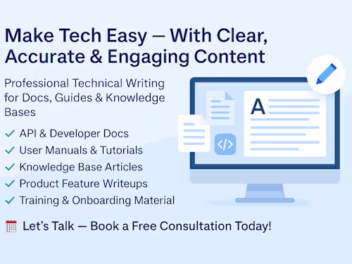 I specialize in creating API documentation, user manuals, developer guides, knowledge base articles, onboarding materials, and product feature documentation—tailored for both technical and non-technical audiences.