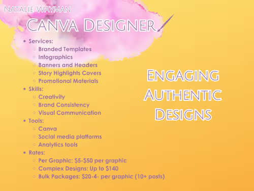 I offer clean and appealing social media graphic design using Canva. I specialize in creating visually captivating graphics tailored to your brand’s identity and social media strategy. Each design is crafted to engage your audience, boost your online presence, and convey your message clearly and attractively.