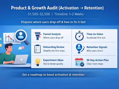 A detailed breakdown of the full user journey from first touch to repeat usage, highlighting friction points and drop-off moments. You get: Funnel map (signup → activation → key actions → retention) Drop-off analysis with priority ranking Clear definition of “activation” for your product