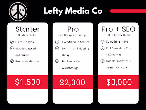 Your site will look sharp and load fast on every device. Includes image compression, metadata, permalinks, and RankMath setup so you’re search‑ready from day one.