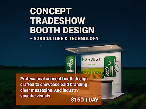 This deliverable includes a concept tradeshow booth design created to showcase professional exhibition graphics for agricultural technology. The design demonstrates bold branding, clear messaging, and farm-friendly visuals optimized for large-format printing. Note: This is a concept design created to demonstrate design skills and can be adapted into real client projects upon request.
