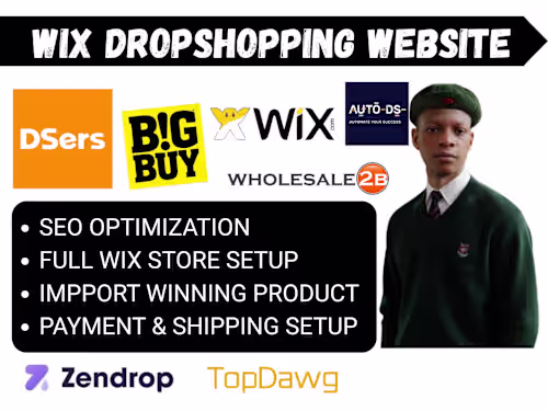 Fully functional Wix dropshipping store Integration with your chosen platform (TopDawg, Wholesale2B, AutoDS, or Modalyst) Professionally designed homepage and product pages Automated product import and fulfillment setup Custom logo and branding (if needed) Mobile-optimized responsive design Payment and shipping settings configured Up to [X] winning products added and listed Navigation and user experience optimization Basic SEO setup for products and pages Store launch checklist and post-delivery support