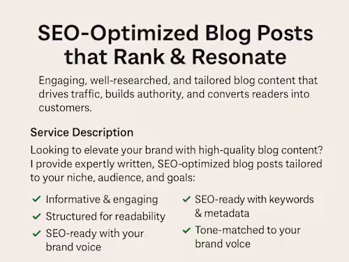 Compelling title (H1), subheadings (H2/H3), and clear formatting Bullet points, lists, and CTAs for reader engagement