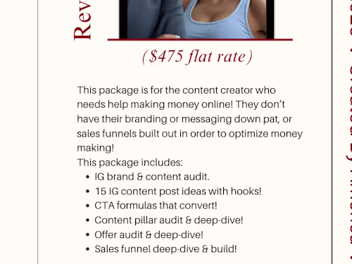 This package is for the content creator who needs help making money online! They don’t have their branding or messaging down pat, or sales funnels built out in order to optimize money making! This package includes: IG brand & content audit. 15 IG content post ideas with hooks! CTA formulas that convert! Content pillar audit & deep-dive! Offer audit & deep-dive! Sales funnel deep-dive & build!