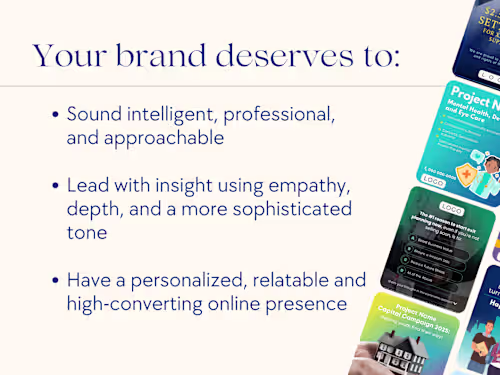 Your brand needs unwavering integrity and executive control. This deep-dive service is a strategic intervention focused on long-term brand health. · Executive-level audit: I perform a thorough analysis of your brand's voice, messaging pillars, and content operations against your core Brand Architecture. · Luxury sector insights: We leverage specialized governance insights from the premium market to set a standard of unwavering quality and coherence that also feels natural to the consumer. · Strategic roadmap: I deliver a concise plan to close critical gaps, eliminating inconsistencies across all platforms (web, social, email, ads). · Governance documentation: You receive the necessary framework to ensure every team member and agency maintains your unified voice. We establish the unwavering brand integrity required to command a premium market position, ensuring your brand is always speaking with one powerful, cohesive voice that feels human and not robotic or monotone.