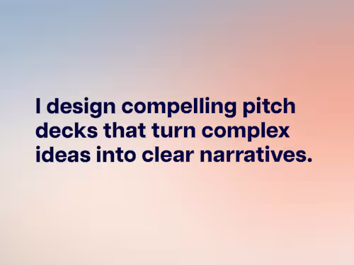 A fully designed presentation built in Google Slides or PowerPoint. Includes content structure, layout development, visual hierarchy, typography systems, branded color integration, and custom slide layouts created specifically for your narrative and audience.
