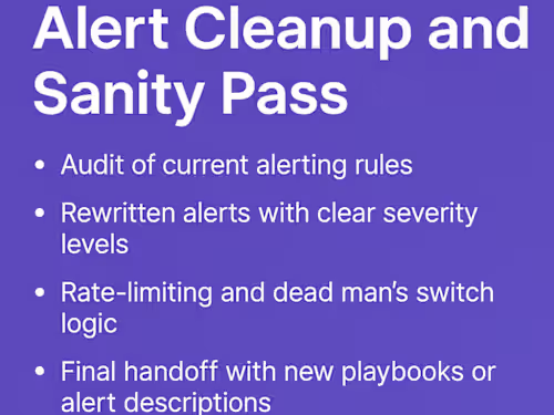 I’ll review your current alerting setup (Prometheus, CloudWatch, Datadog, etc.) and identify noisy, duplicate, or broken rules.