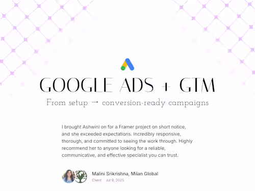 I brought Ashwini on for a Framer project on short notice, and she exceeded expectations. Incredibly responsive, thorough, and committed to seeing the work through. Highly recommend her to anyone looking for a reliable, communicative, and effective specialist you can trust.