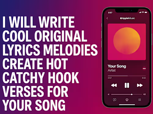 1. Original Song Lyrics (Full Song / Verse / Chorus) 2. Custom Melody Line (Written or Audio Reference) 3. Hook or Chorus Creation 4. Song Structure (Intro, Verse, Chorus, Bridge, Outro) 5. Rhyme Scheme & Flow Optimization 6. Vocal Guide Demo (optional) 7. Editable Lyrics File (DOC/TXT) 8. Lyric Sheet in PDF Format 9. Genre-Adapted Writing (Pop, R&B, Hip-Hop, etc.) 10. One Round of Revisions (optional)