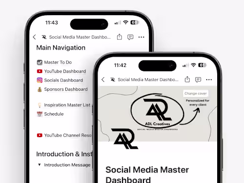 Unlock a personalized hub designed to streamline your social media efforts. Inside, find a Master To-do list, YouTube Dashboard, Socials Dashboard, Sponsors Dashboard, Inspiration Master list, Scheduling, and YouTube Channel Resources, providing an all-in-one solution for efficient organization and enhanced productivity.