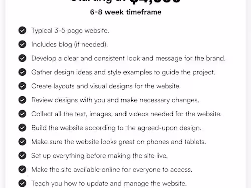 - Typical 3-5 page website. - Includes blog (if needed). - Build the website according to the agreed-upon design. - Make sure the website looks great on phones and tablets. - Set up everything before making the site live. - Make the site available online for everyone to access.