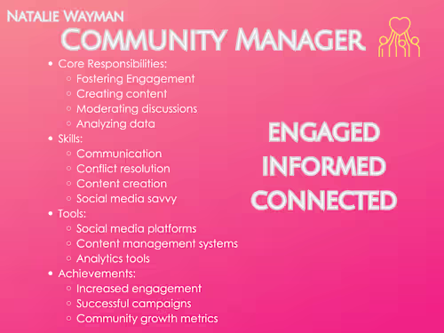 I specialize in building vibrant online communities where members feel connected, informed, inspired, and valued. My approach ensures that each community is not only a hub of engagement, fostering meaningful interactions and providing valuable content, but also feels authentic and genuine, keeping members motivated and involved.