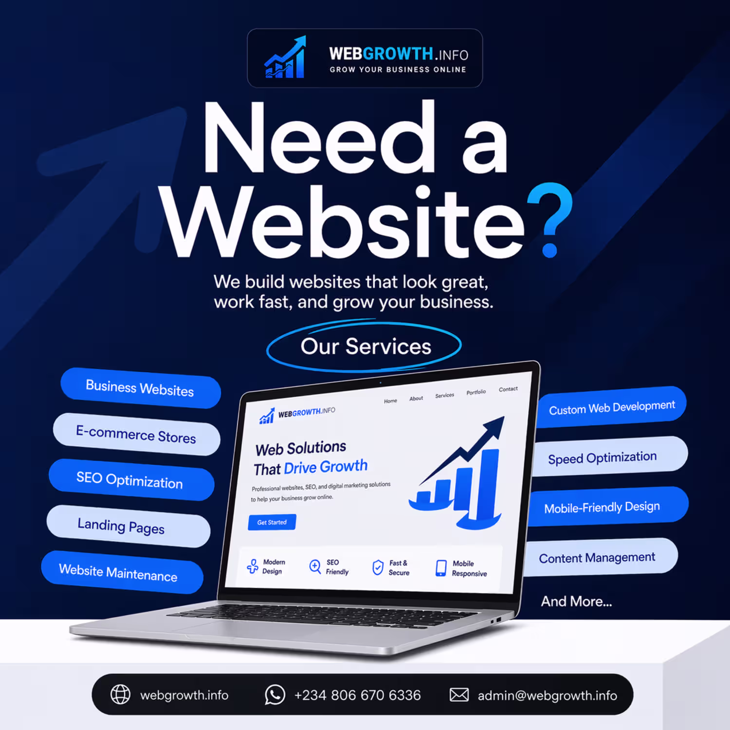 This project is a portfolio showcase graphic for webgrowth, created to present the brand as a modern, conversion-focused web design business. The goal was to communicate professionalism, trust and growth by highlighting responsive design, speed, business websites, e-commerce, landing pages and maintenance services in one clean visual. It was design to work as a strong promotional asset for social media, freelance platforms and client outreach.
