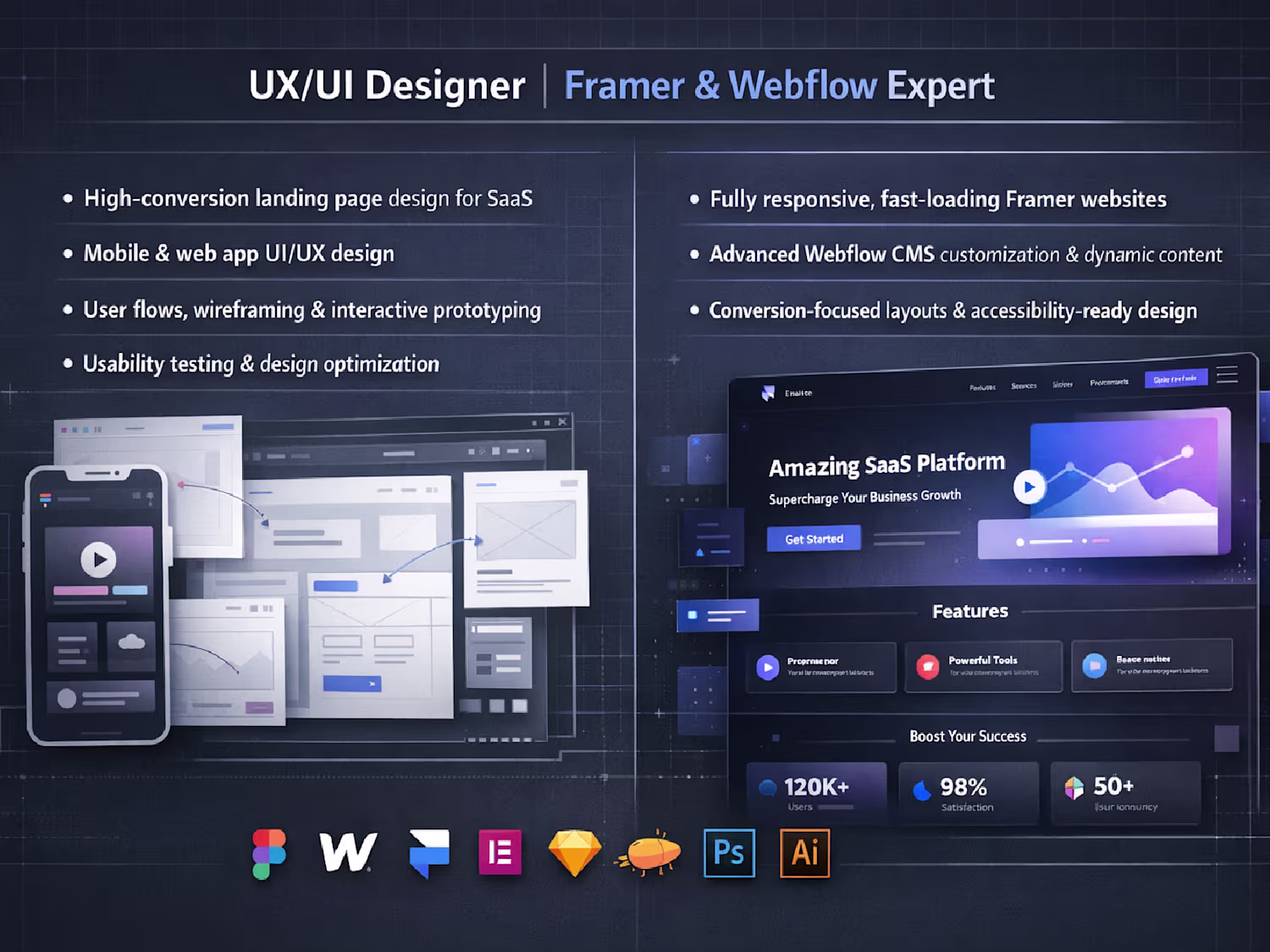 and Illustrator, refining UX/UI, content hierarchy, and brand consistency.