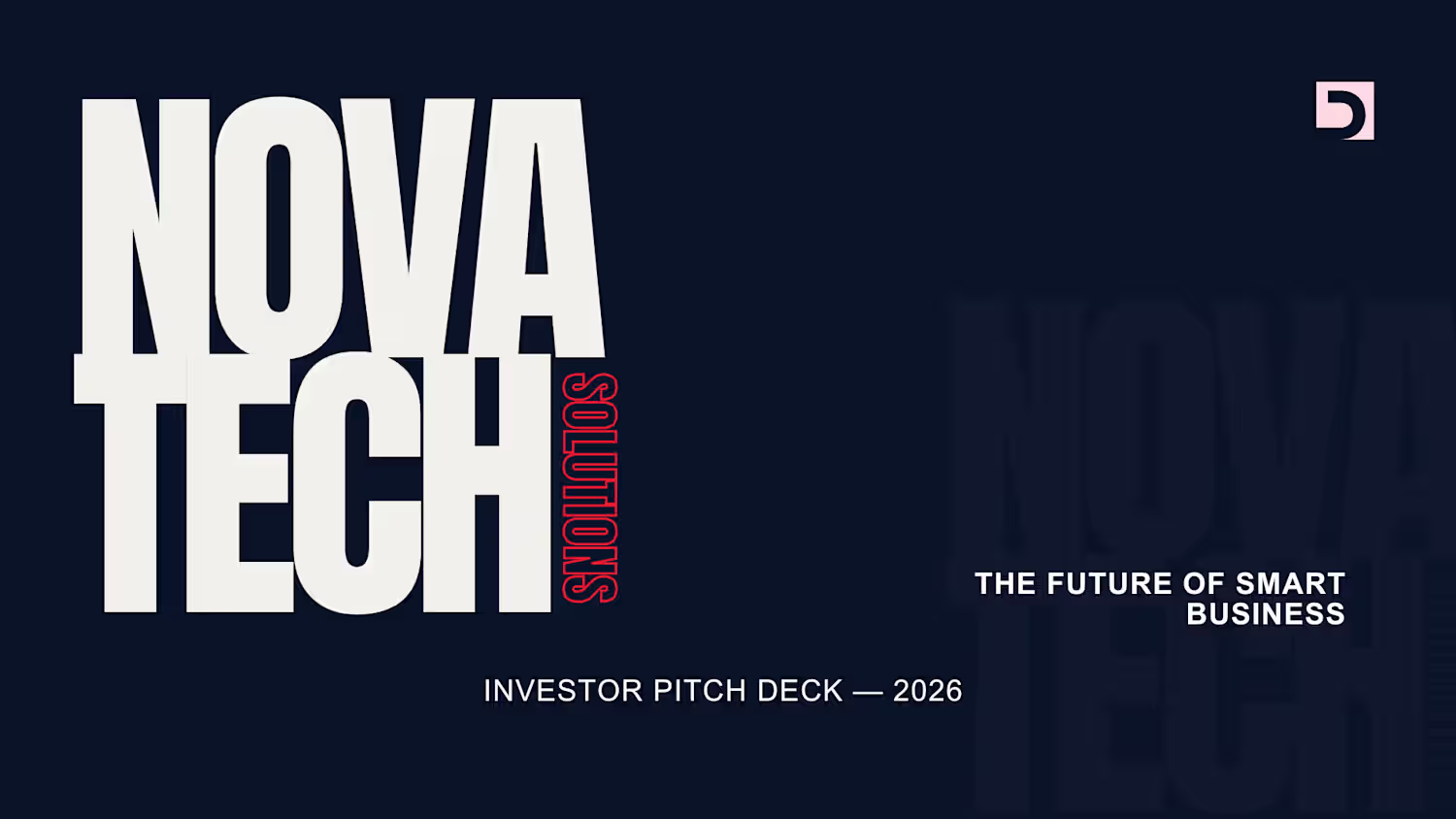 NovaTech — Pitch Deck Slide "Title slide designed for a US tech startup investor pitch deck. Bold typography, dark navy palette, and a professional layout that commands attention in the room."
